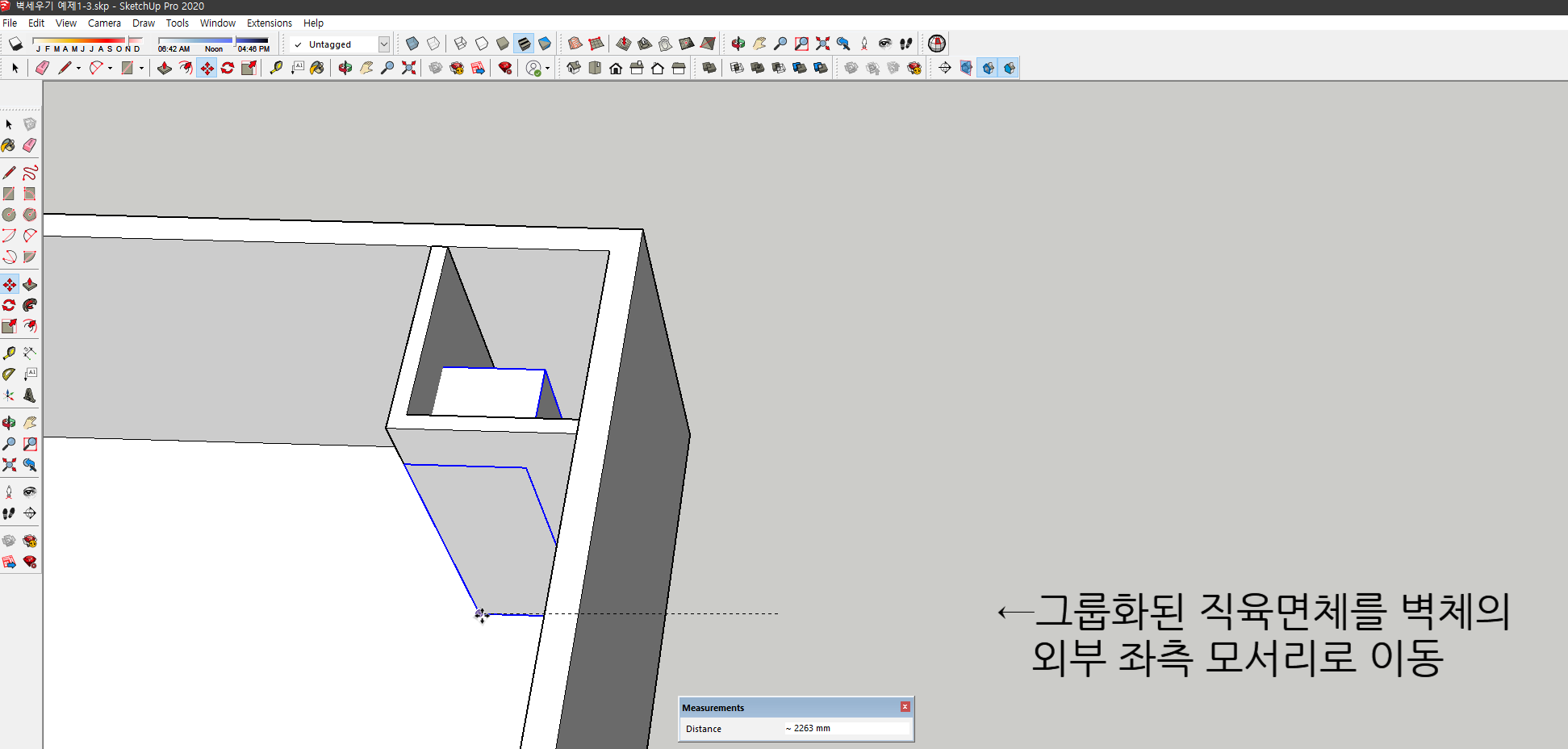 4. 그룹화된 직육면체를 벽체의 외부 좌측 모서리로 이동