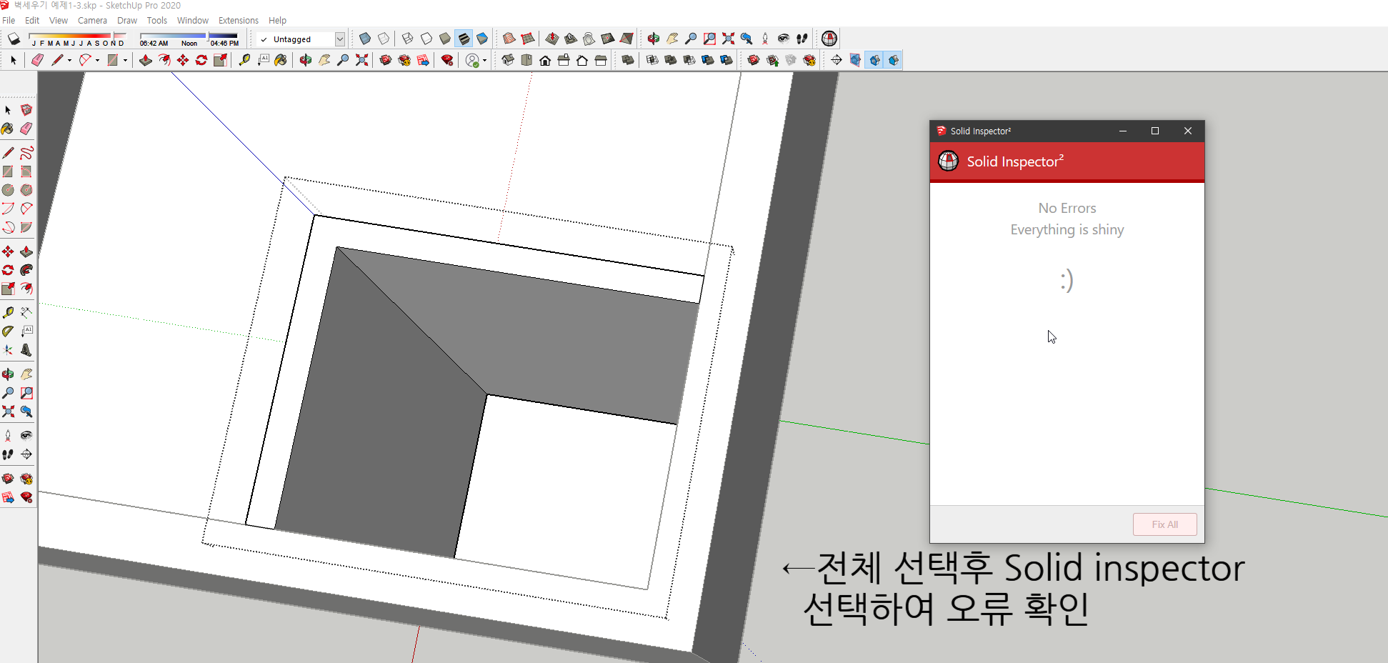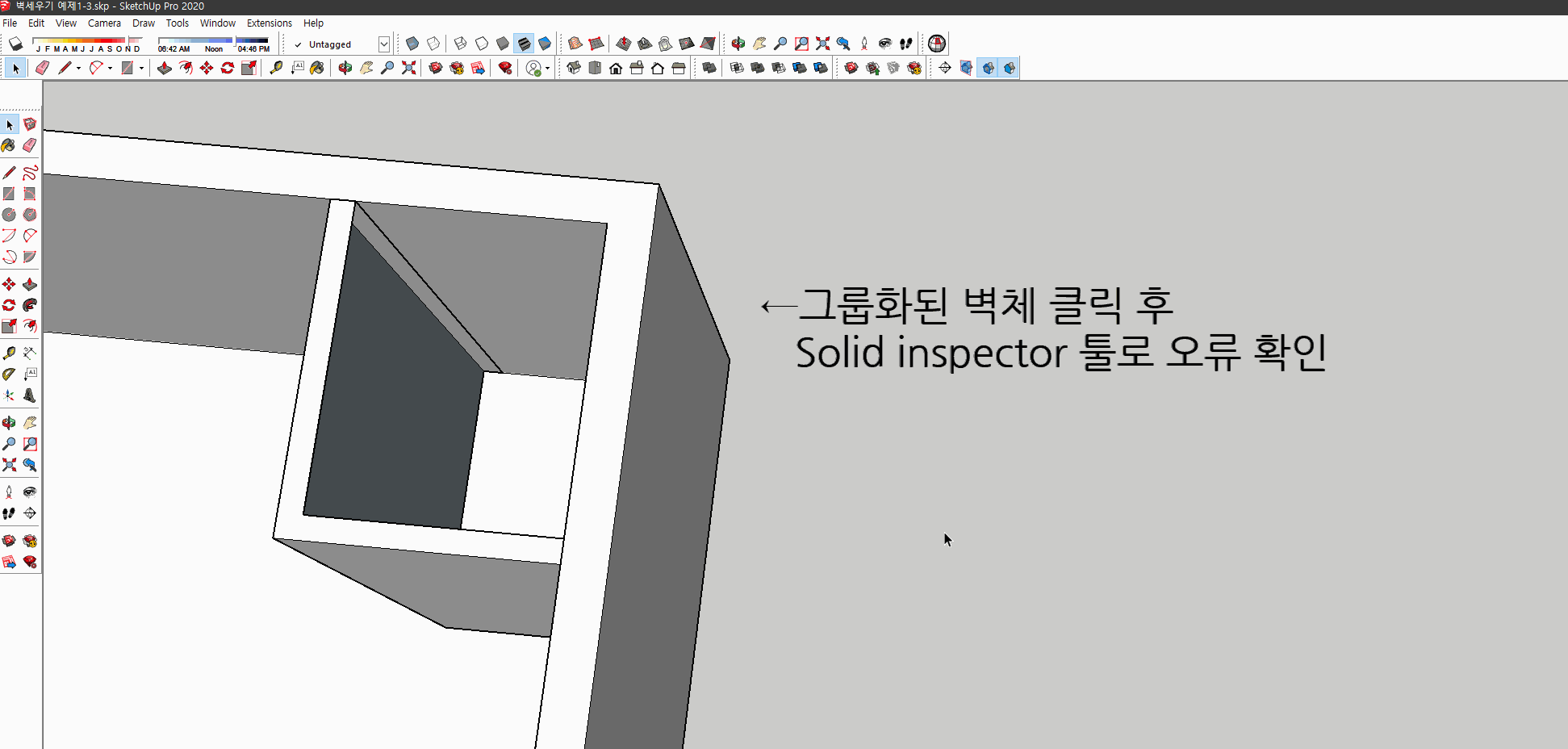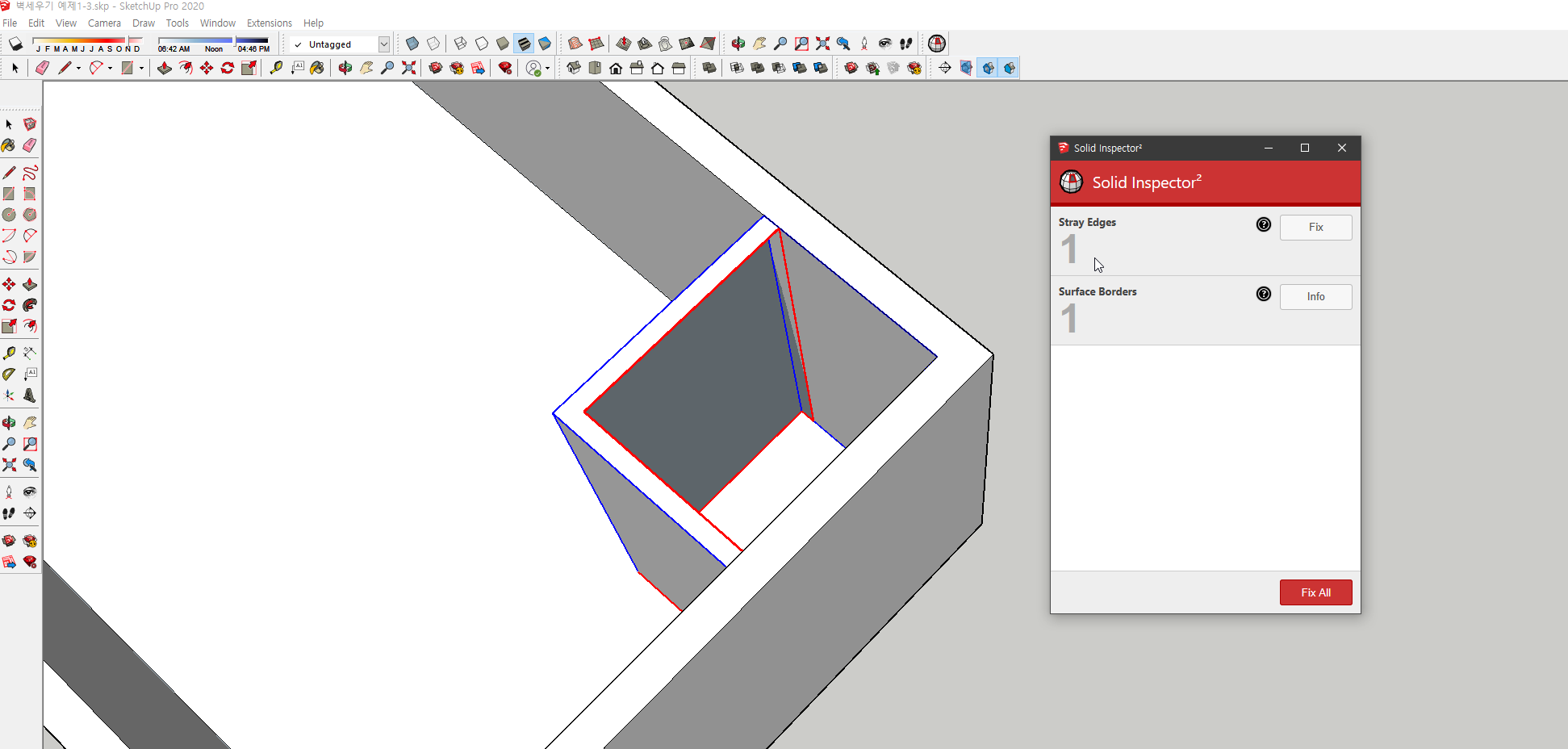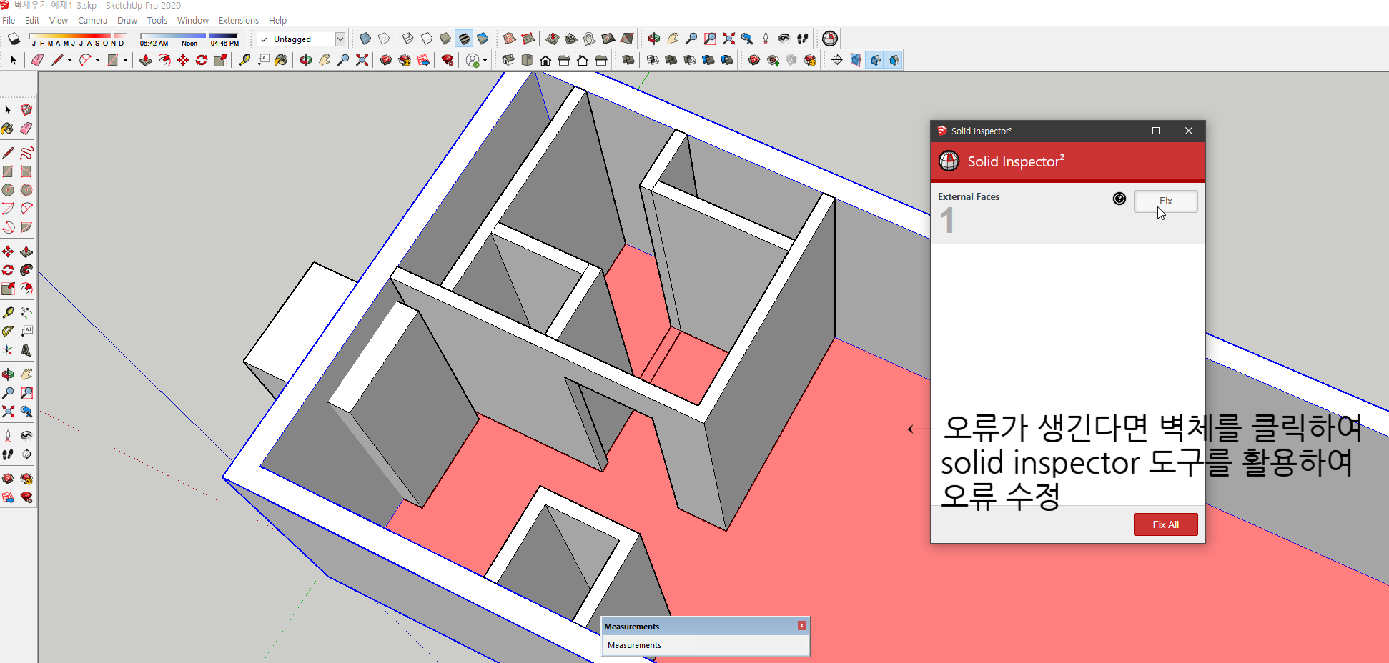 6. 오류가 생긴다면 벽체를 클릭하여 solid inspector 도구를 활용하여 오류 수정