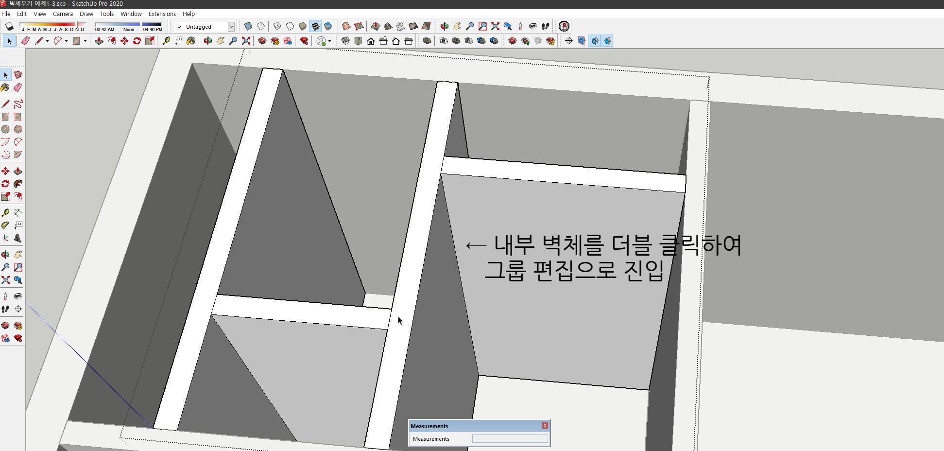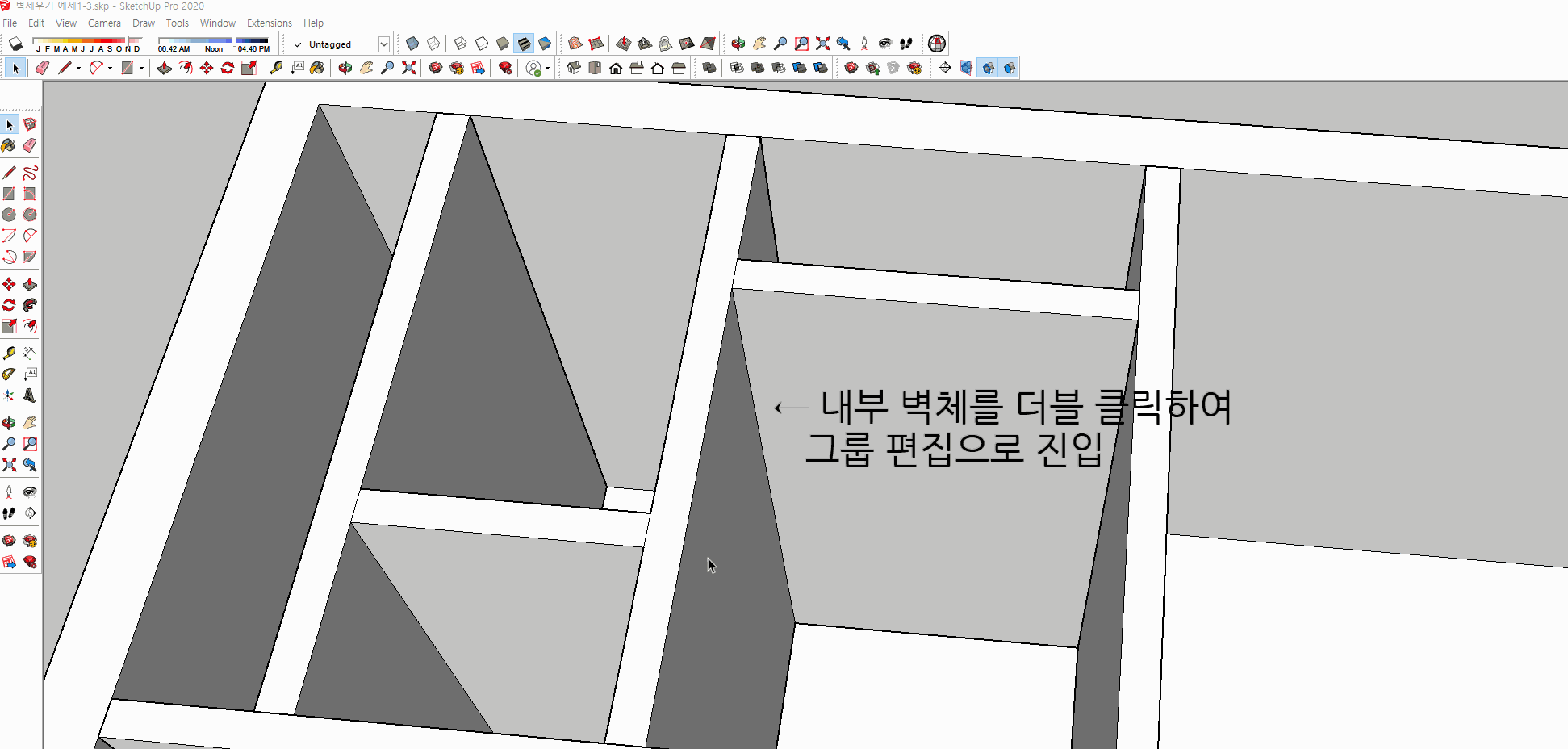 1. 내부 벽체를 더블 클릭하여 그룹 편집으로 진입