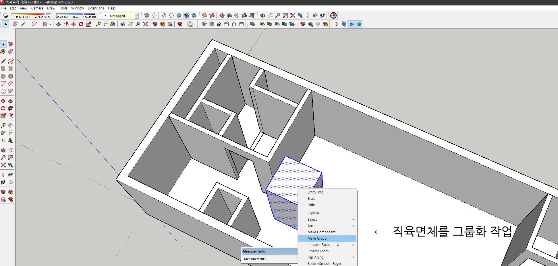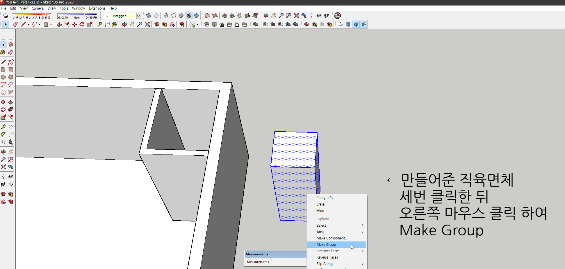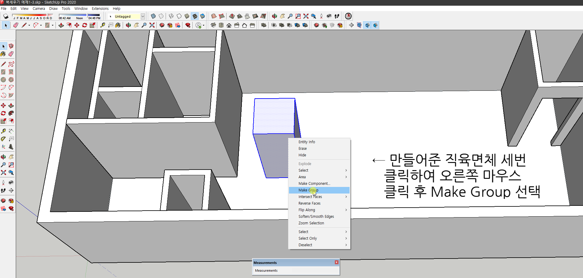 2. 만들어준 직육면체 세번 클릭하여 오른쪽 마우스 클릭 후 Make Group 선택