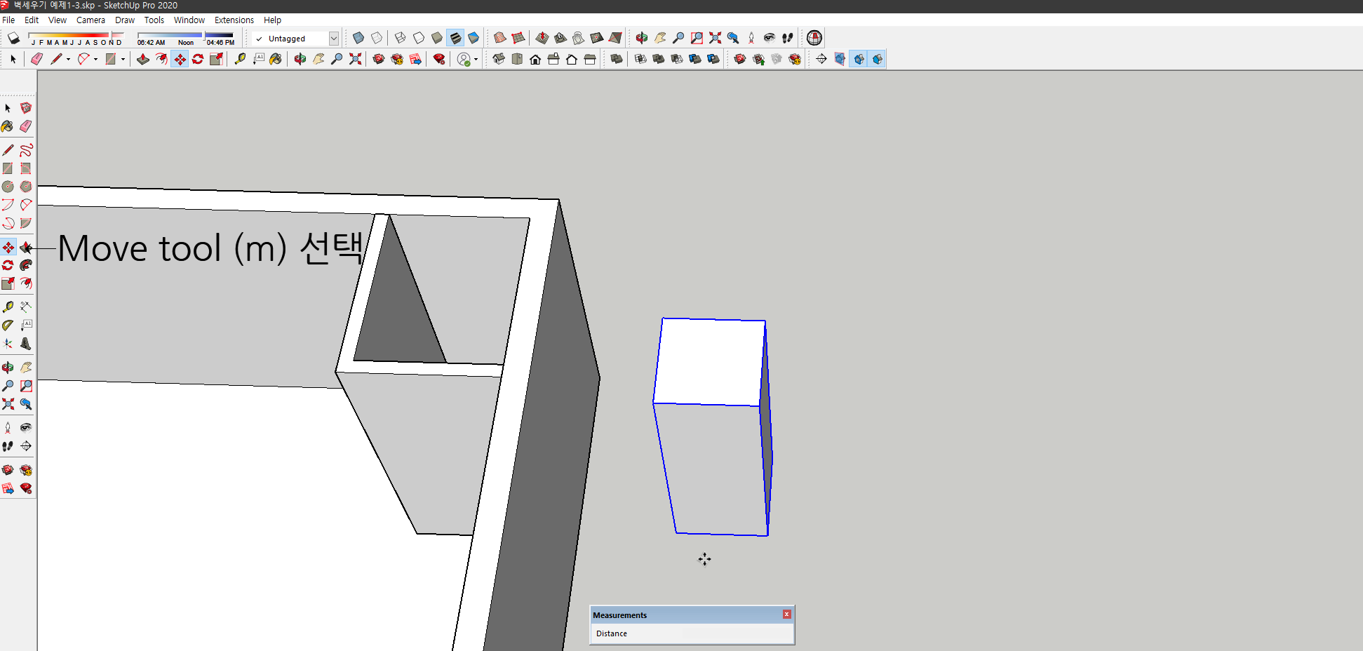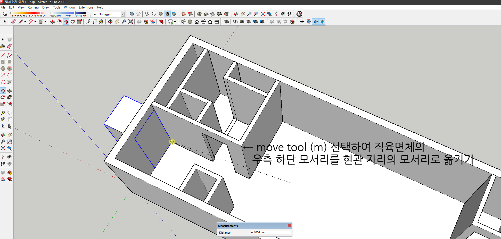 3. move tool (m) 선택하여 직육면체의 우측 하단 모서리를 현관 자리의 모서리 로 옮기기