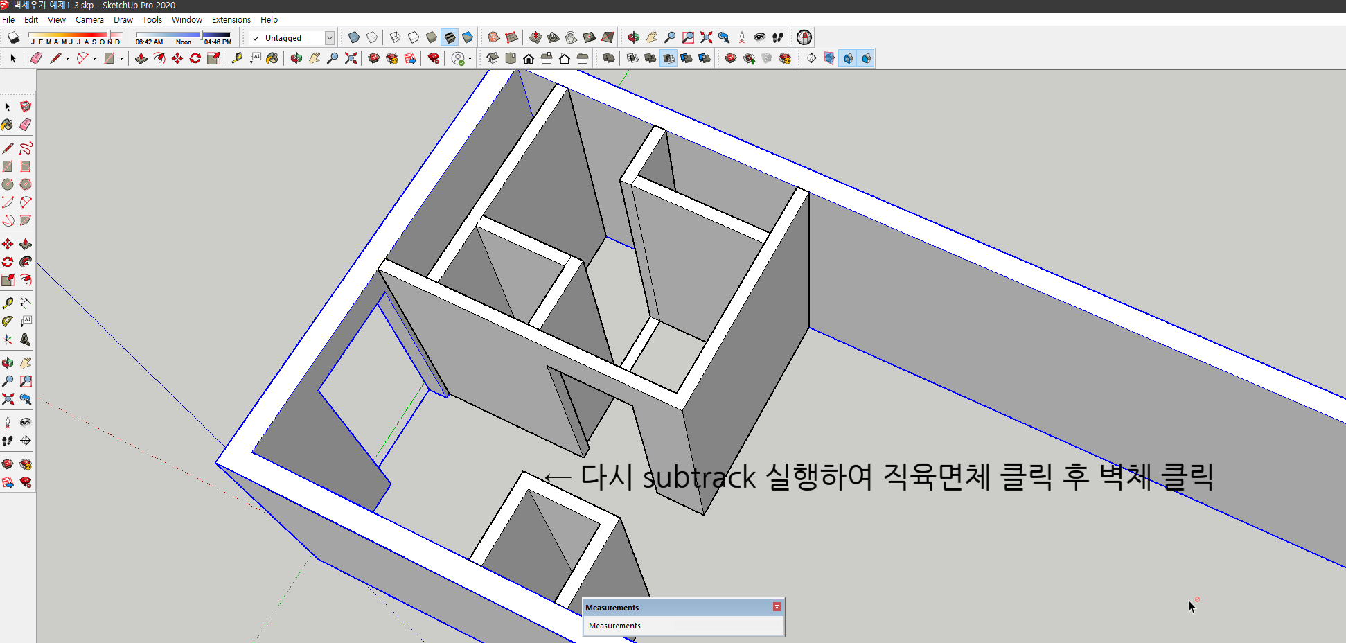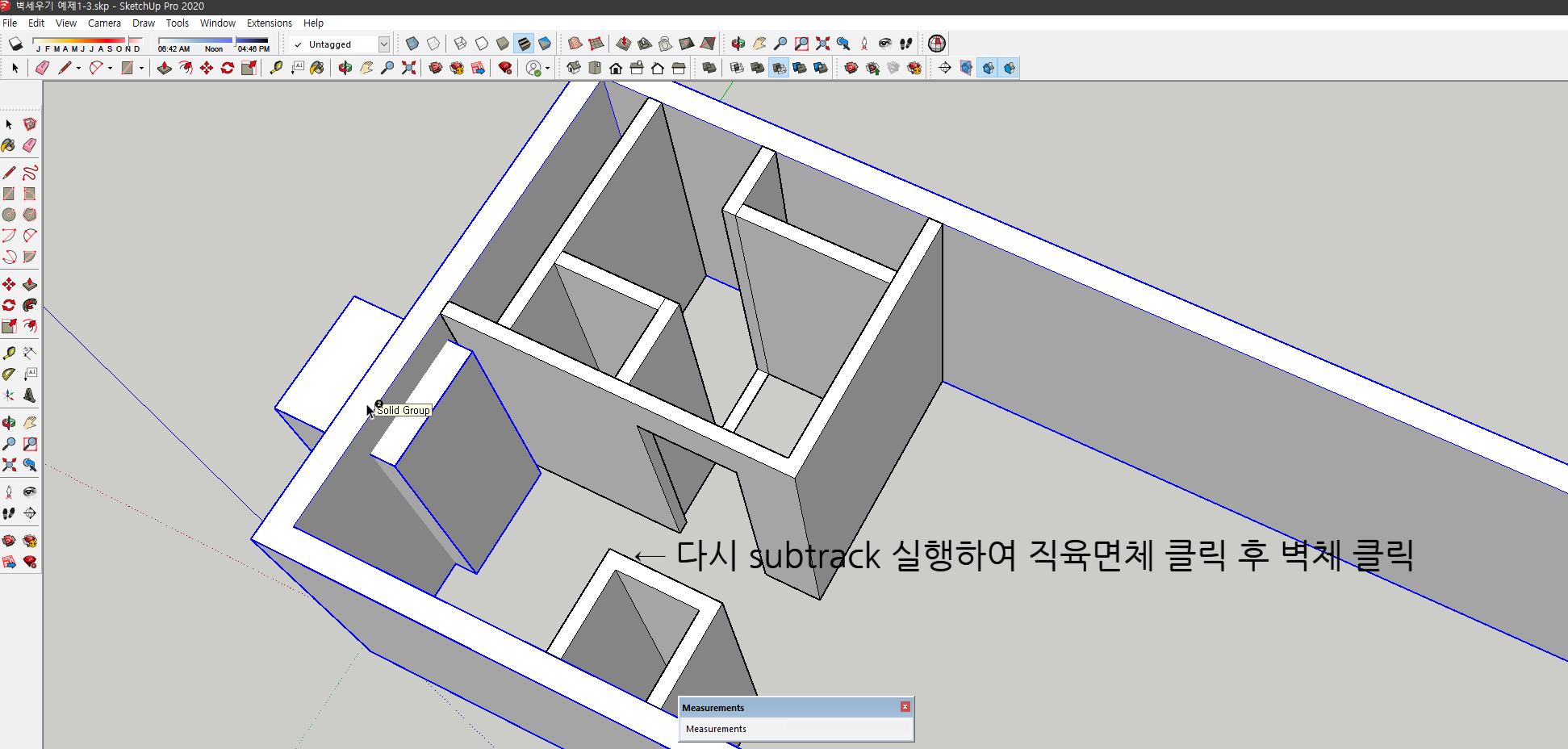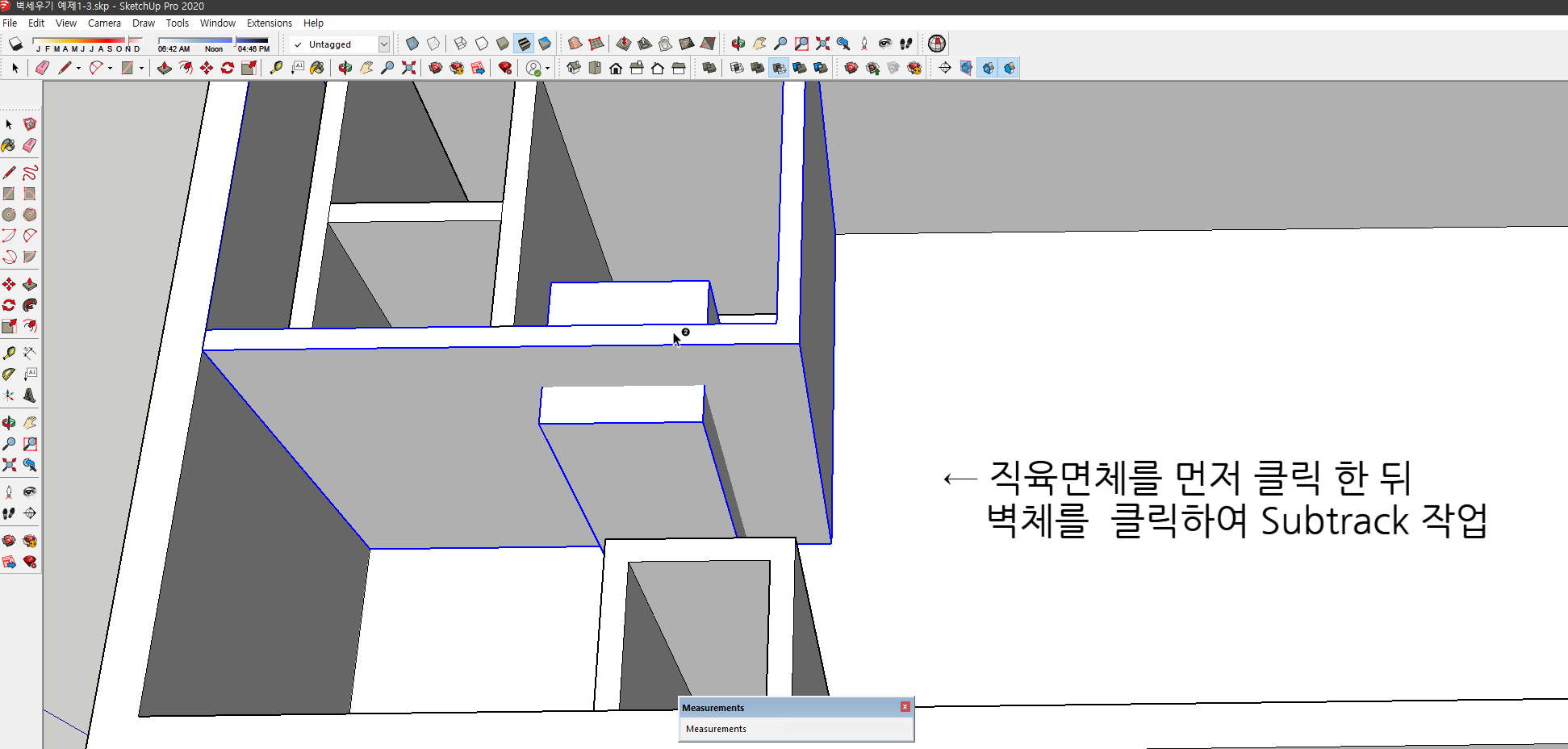 7. 직육면체를 먼저 클릭 한 뒤 벽체를 클릭하여 Subtrack 작업