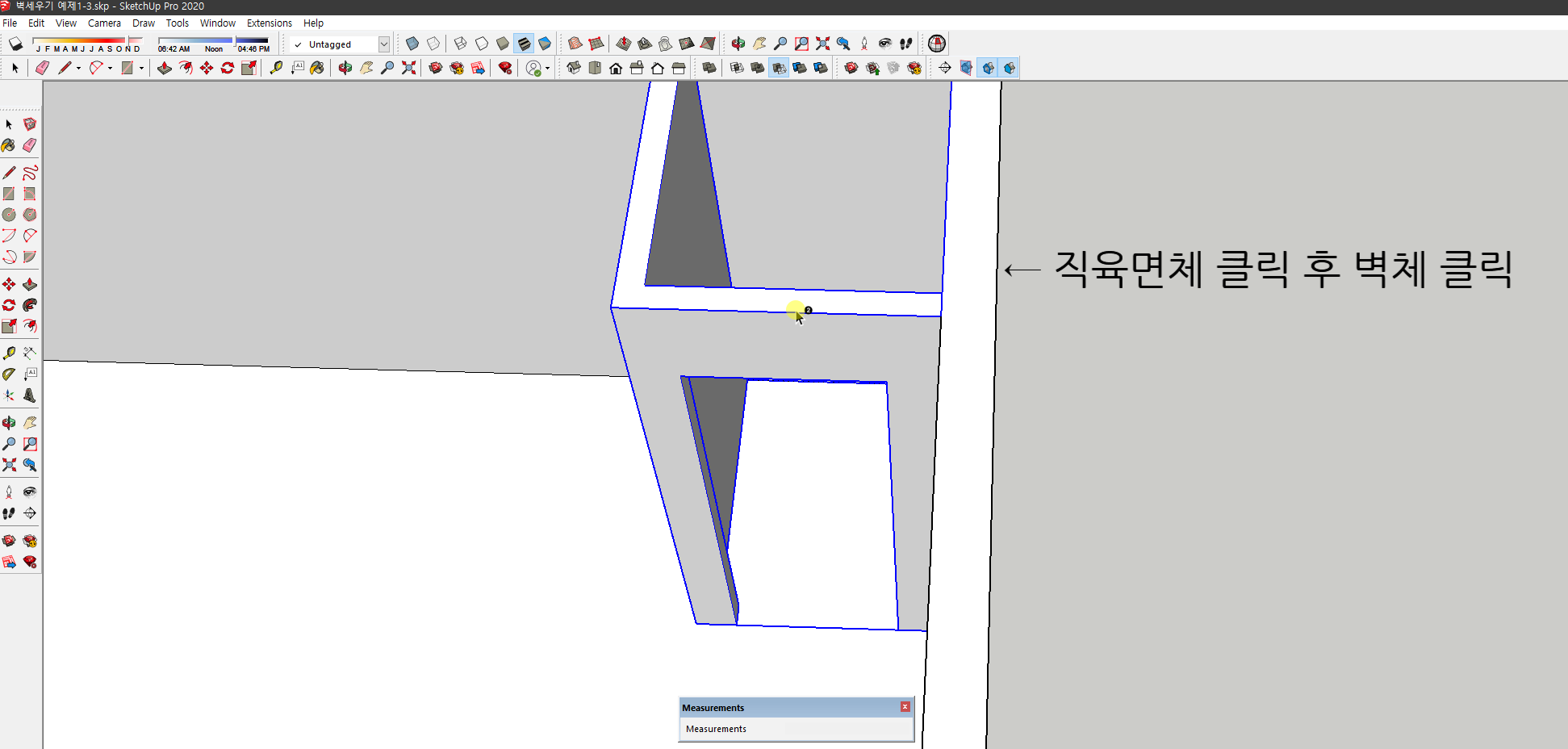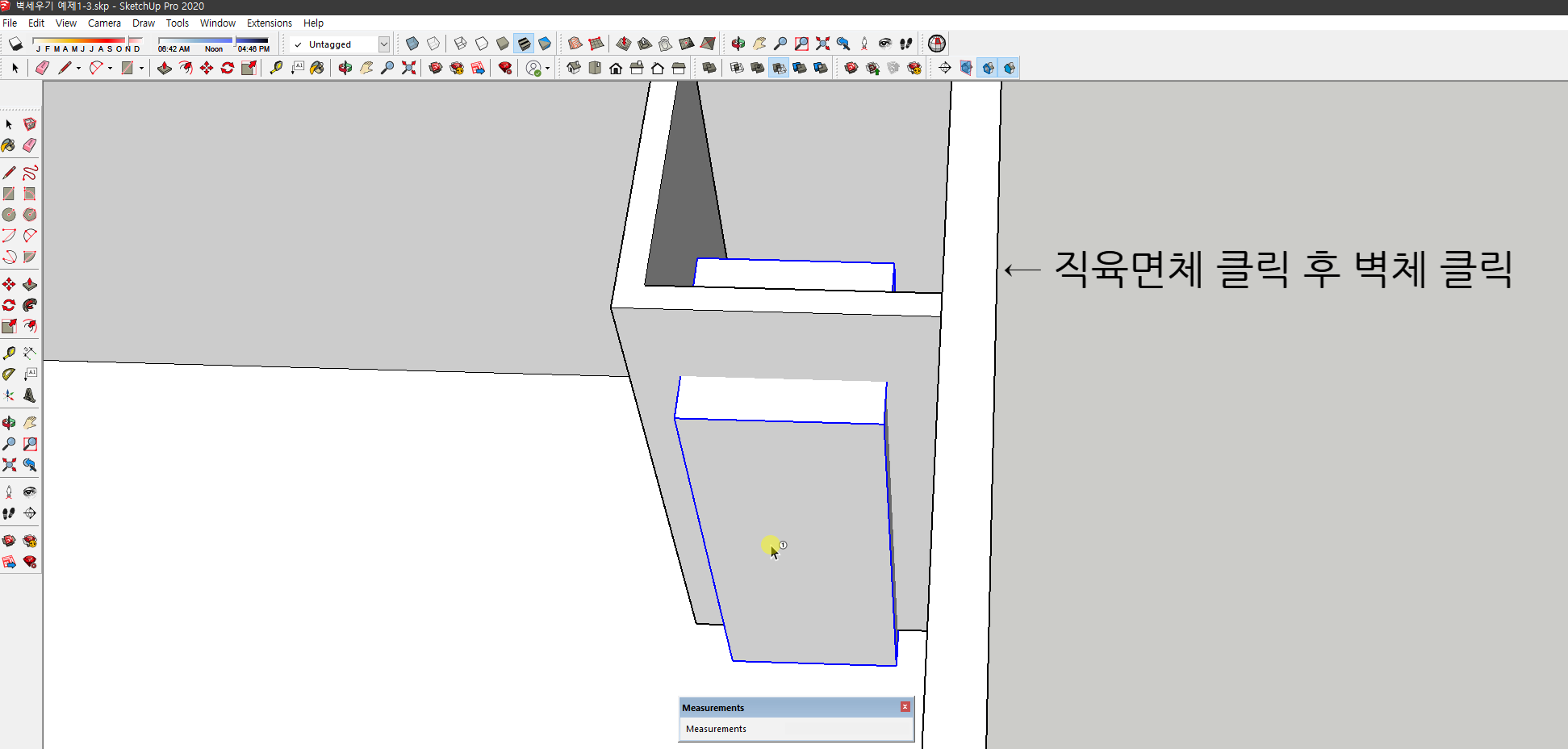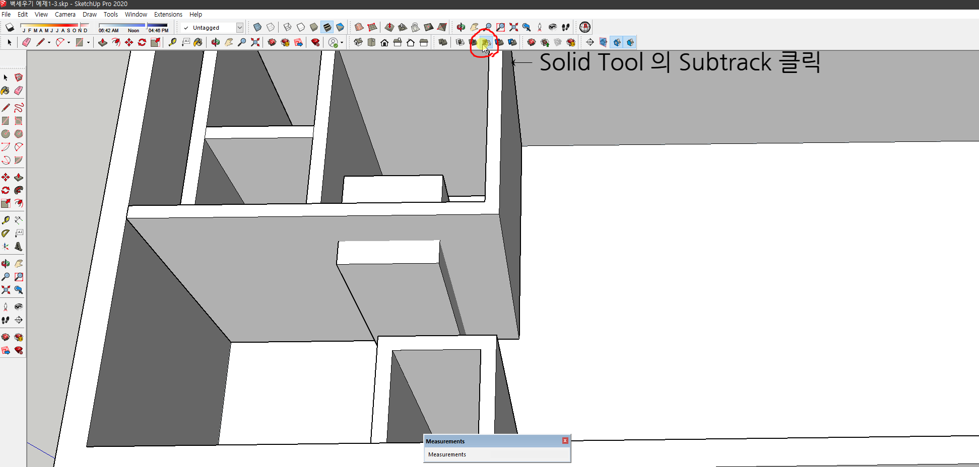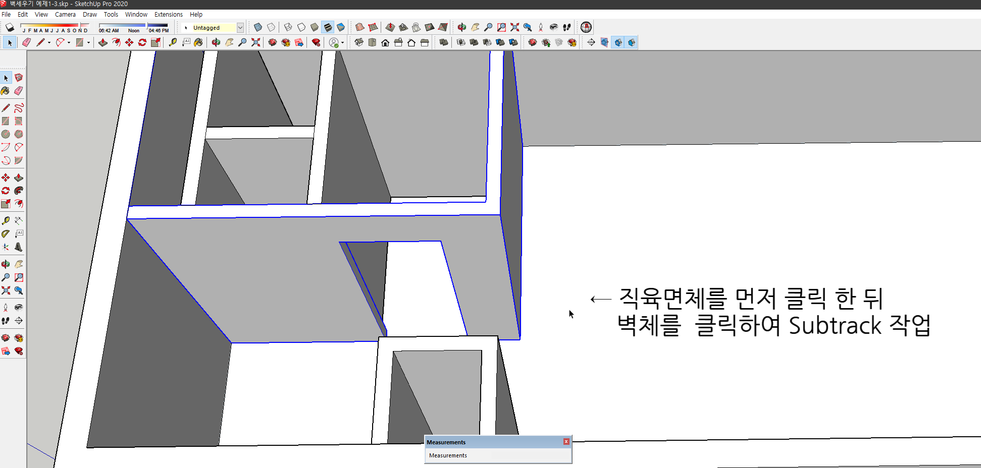 7. 직육면체를 먼저 클릭 한 뒤 벽체를 클릭하여 Subtrack 작업