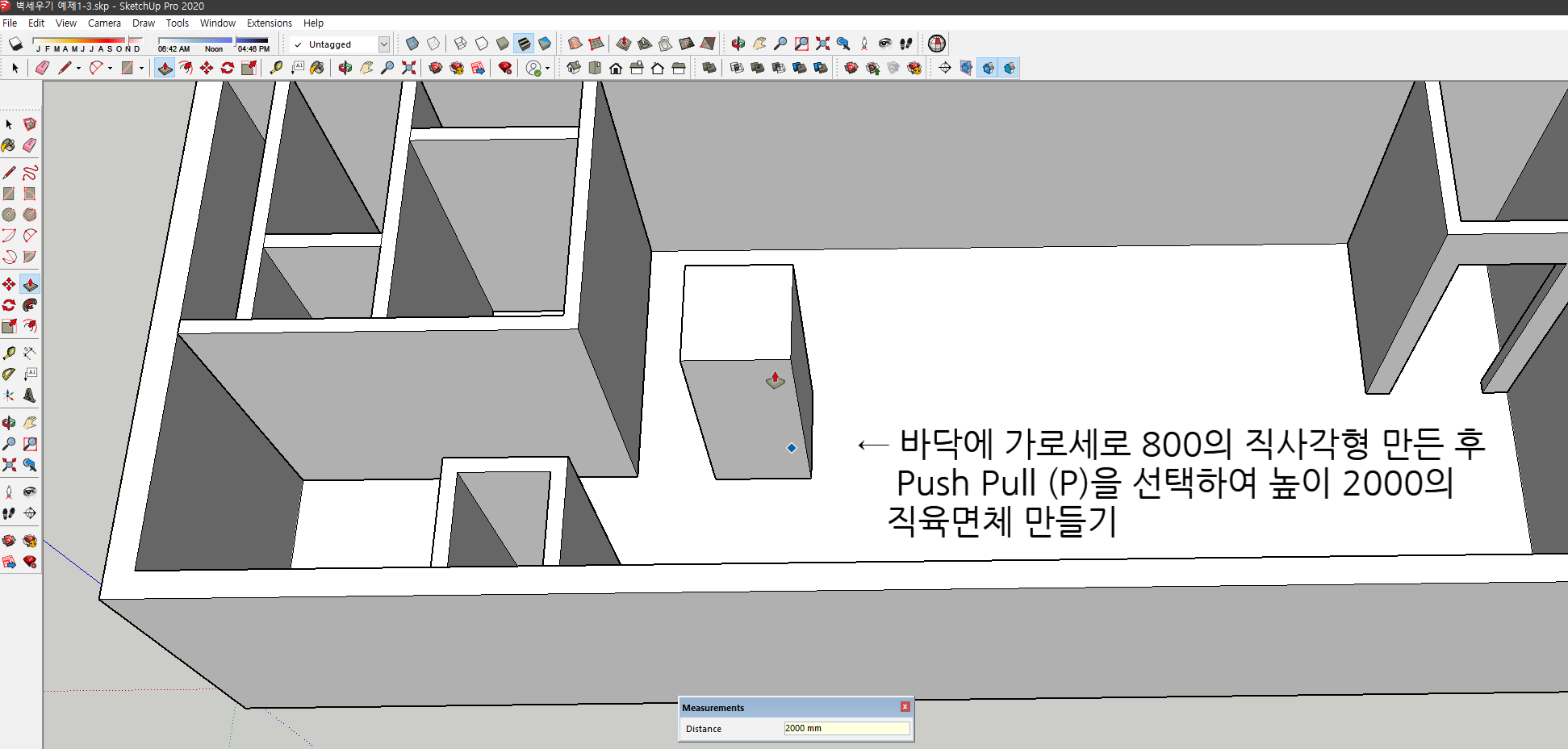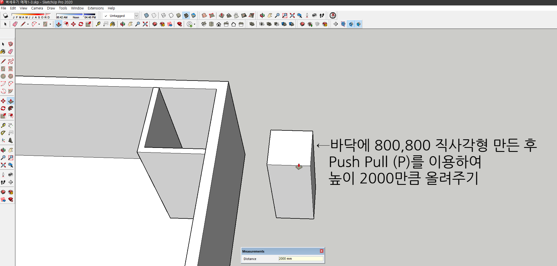 1. 바닥에 800,800 직사각형 만든 후 Push Pull (P)를 이용하여 높이 2000만큼 올려주기
