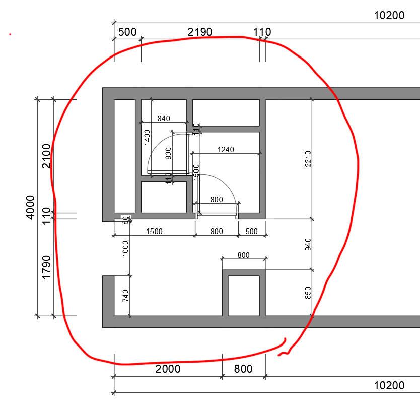 - 화장실과 화장실 내부의 샤워공간, 현관 문이 들어갈 개구부를 만들어주는 작업을 하겠습니다. 샤워실 공간의 경우 칸막이 도어가 들어갈 예정으로 천장부터 바닥까지 다 뚫어줄 것입니다. 현관문의 경우 일반적인 방문 크기보다 더 큰 높이 2200에 폭 1000의 개구부를 만들도록 하겠습니다.