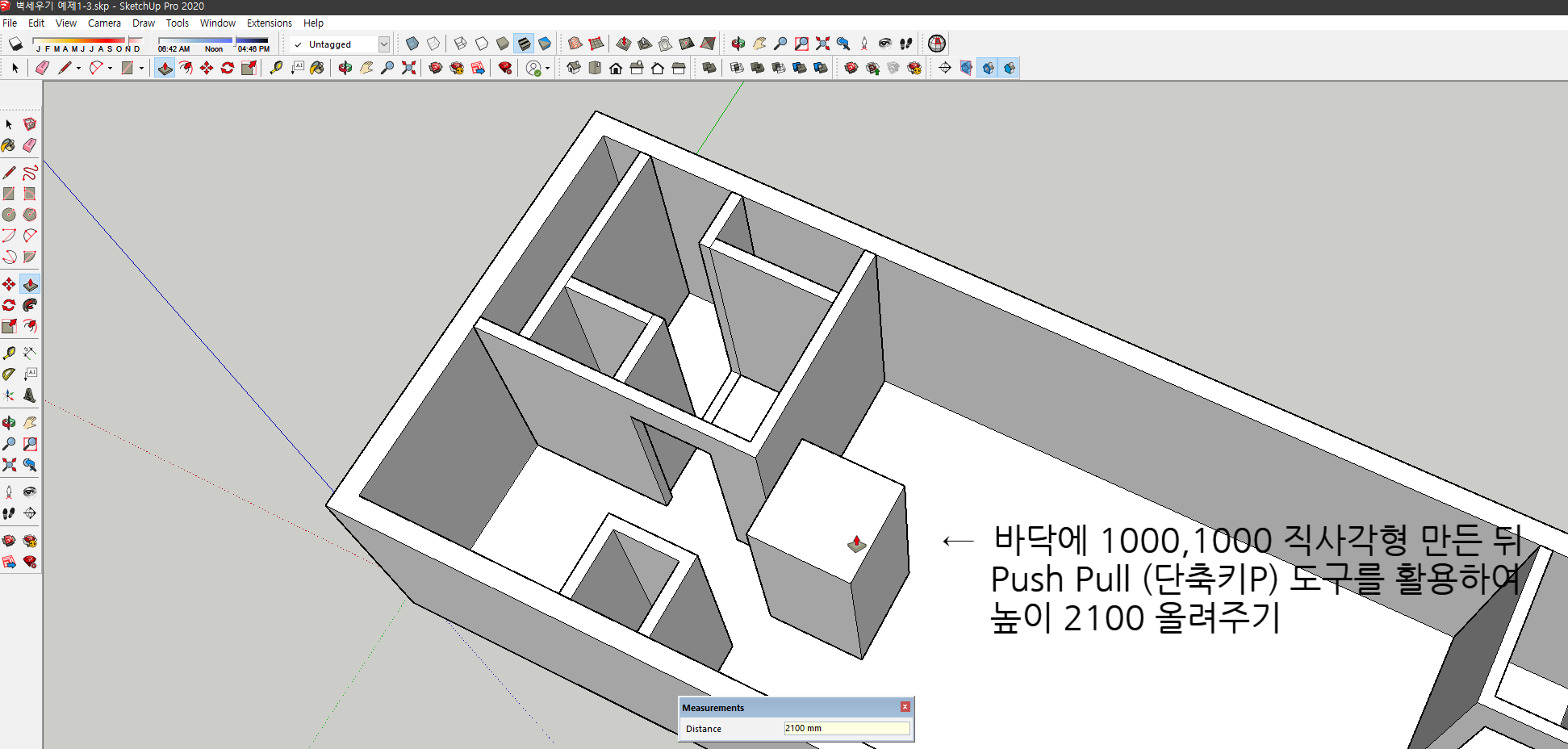 1. 바닥에 1000,1000 직사각형 만든 뒤 Push Pull (단축키P) 도구를 활용하여 높이 2100 올려주기