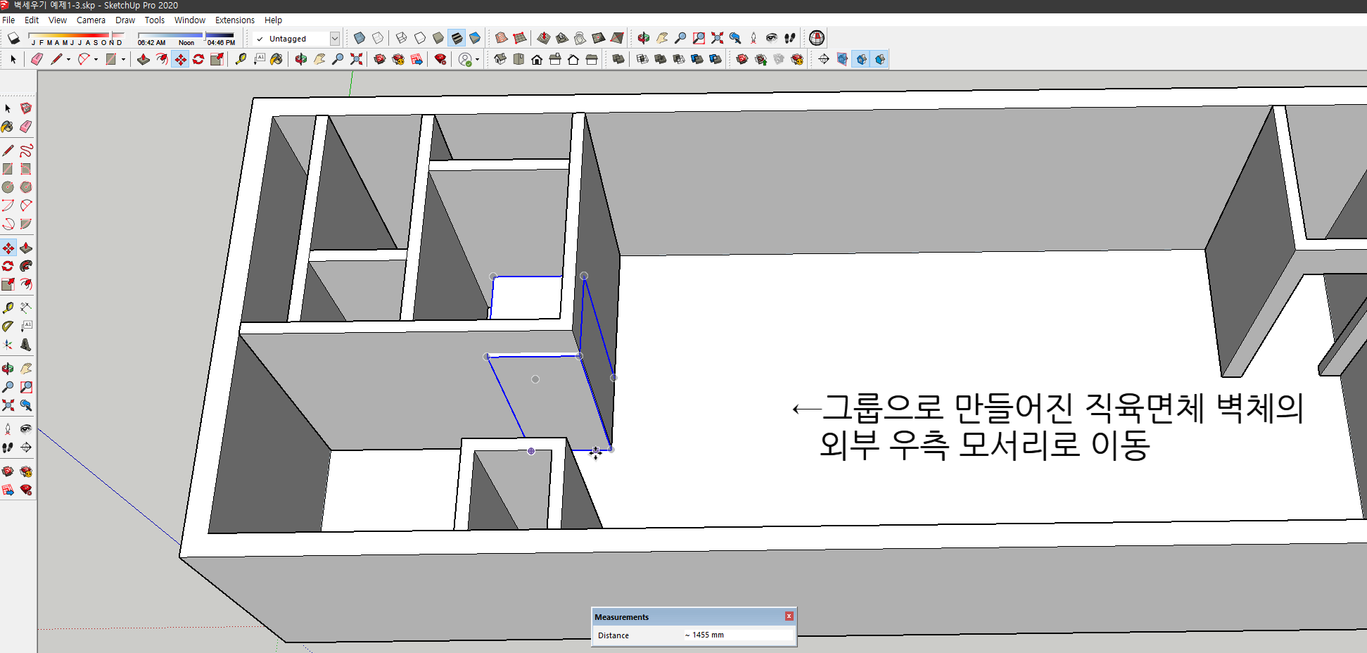 4. 그룹으로 만들어진 직육면체 벽체의 외부 우측 모서리로 이동