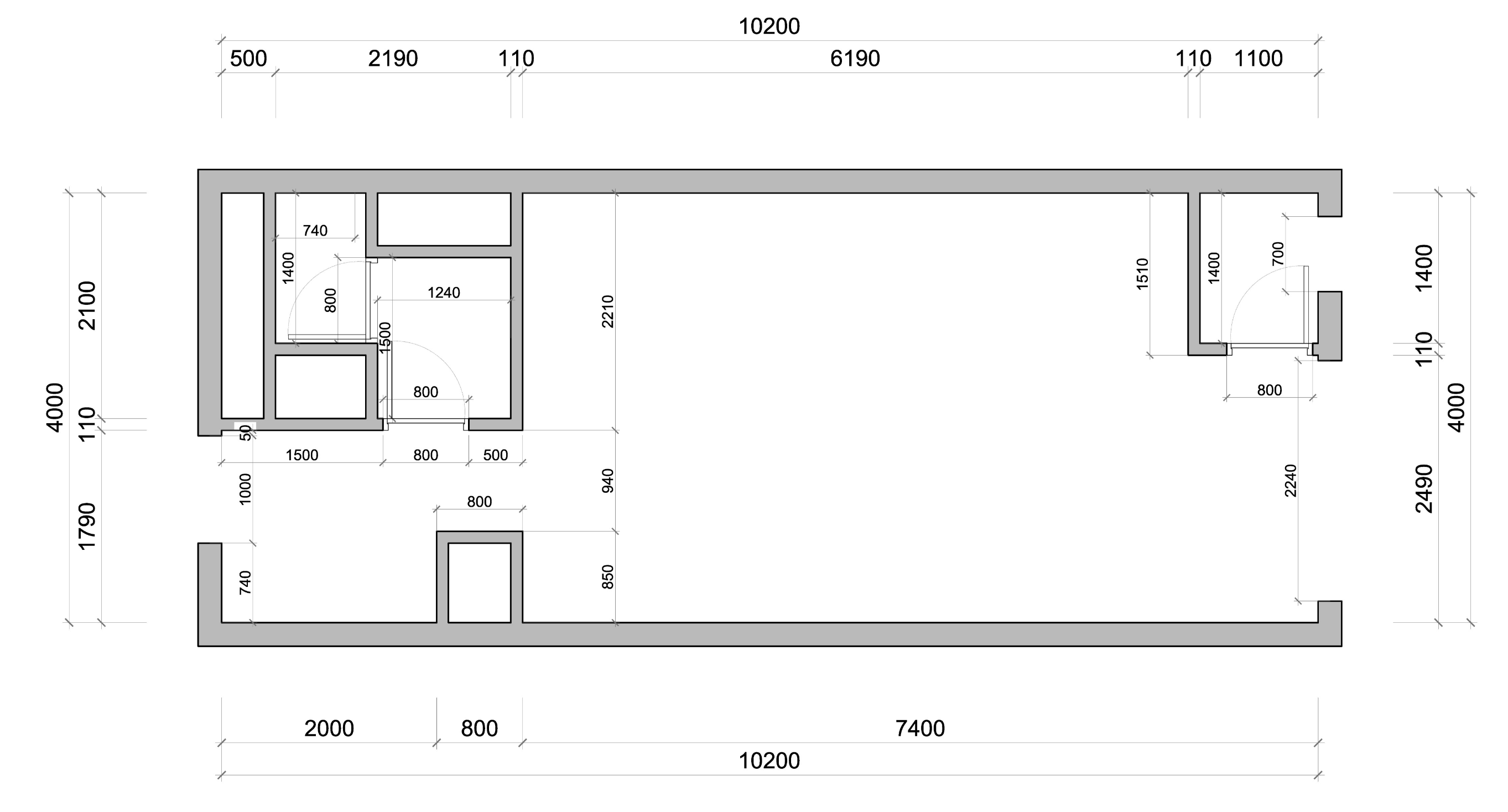 - 인테리어 도면은 가독성을 위해 모든 치수를 표현하지 않는 경우들이 많습니다. 이럴때 다른 치수들을 통해 원하는 치수를 알아내야 합니다. 물론 캐드파일을 불러내서 작업을 하는 방법이 있으나 도면에 익숙해지는 것이 좋고 치수를 유추하는 것은 실무에서 꼭 필요한 작업이기 때문에 하나하나 작업해보시는 것을 추천드립니다. 문과 같은 개구부는 추후에 뚫어줄 예정입니다.
