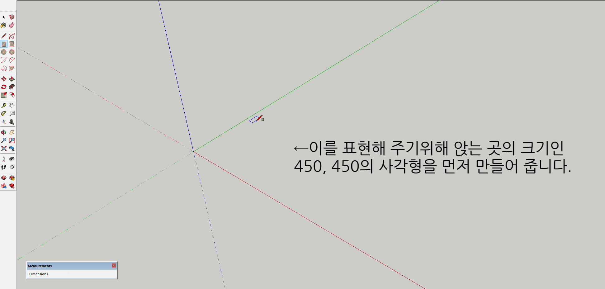 스케치업의 Rectangle [사각형] 도구는 도구의 이름에서 알 수 있듯 사각형을 그리는 도구입니다. 선을 통해 사각형을 그리려면 선을 4개를 그려야하지만 Rectangle 도구를 사용한다면 한번에 그릴 수 있어 시간을 단축할 수 있습니다.