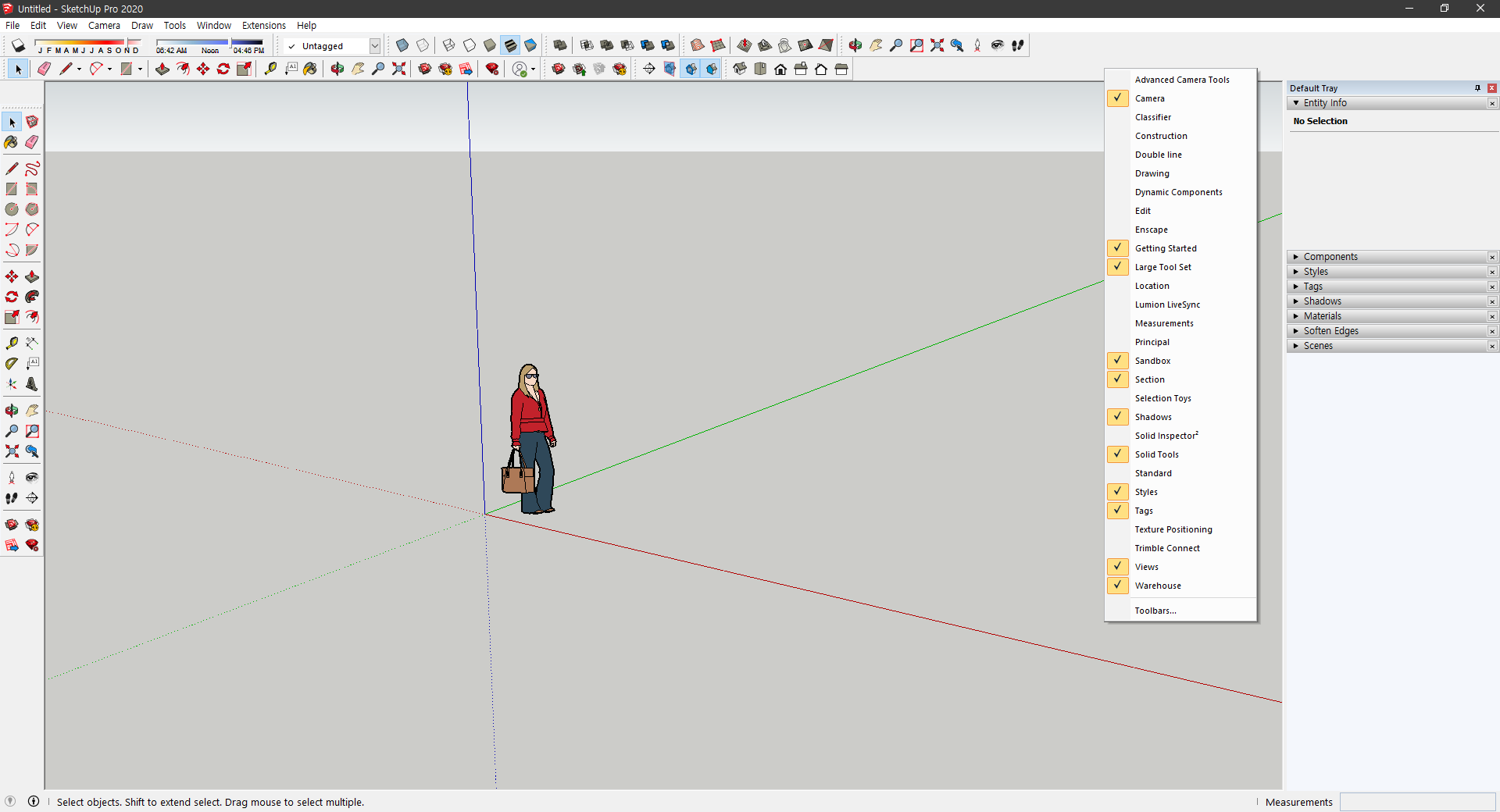 2. Camera, Getting Started, Large Tool Set, SandBox, Section, Shadows, Solid Tools, Styles, Tags, Views, Warehouse 클릭하여 켜기